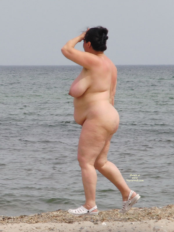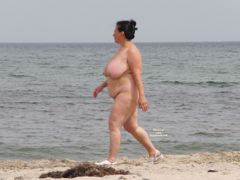 Mature woman on the nude beach with big tits, but a big body, too.